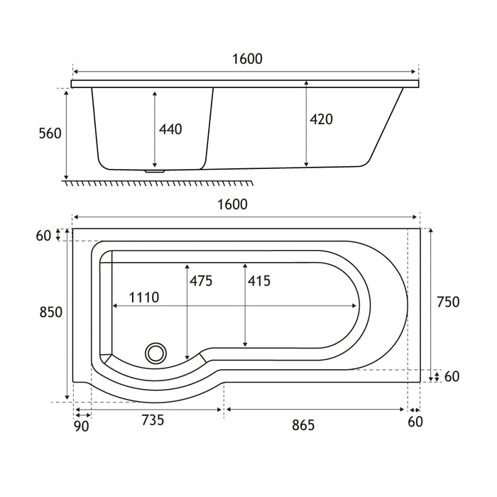 | Full Description | Portland P-Shape 1600x850x700 LH (440) 5mm |
