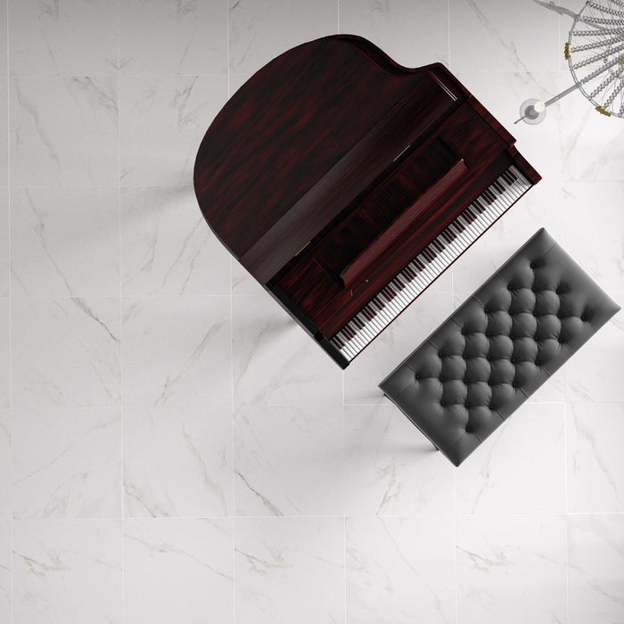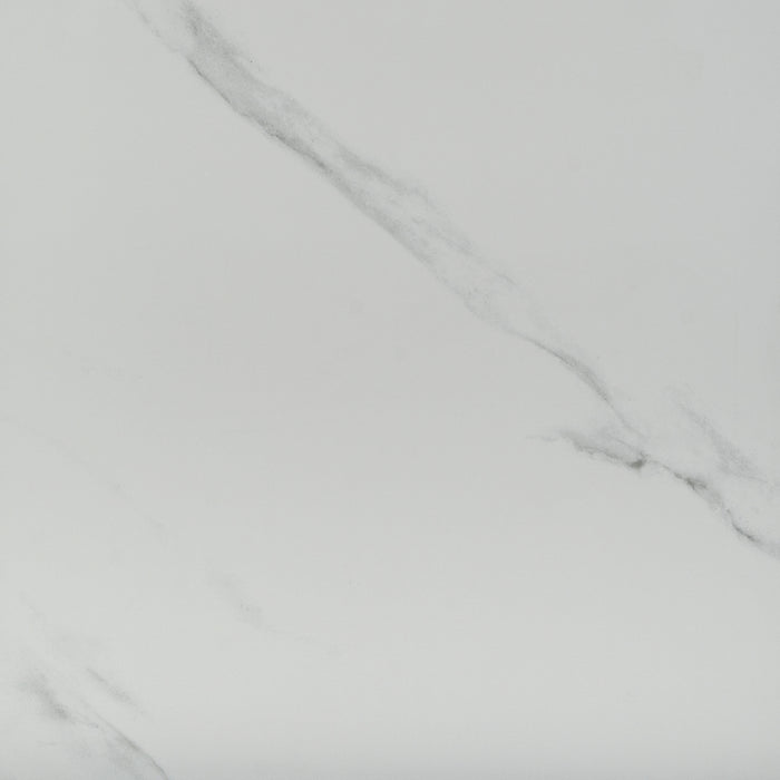 A bright white body marble effect tile with dark grey veining. A brilliantly versatile tile that authentically replicates natural white stone Carrera marble.