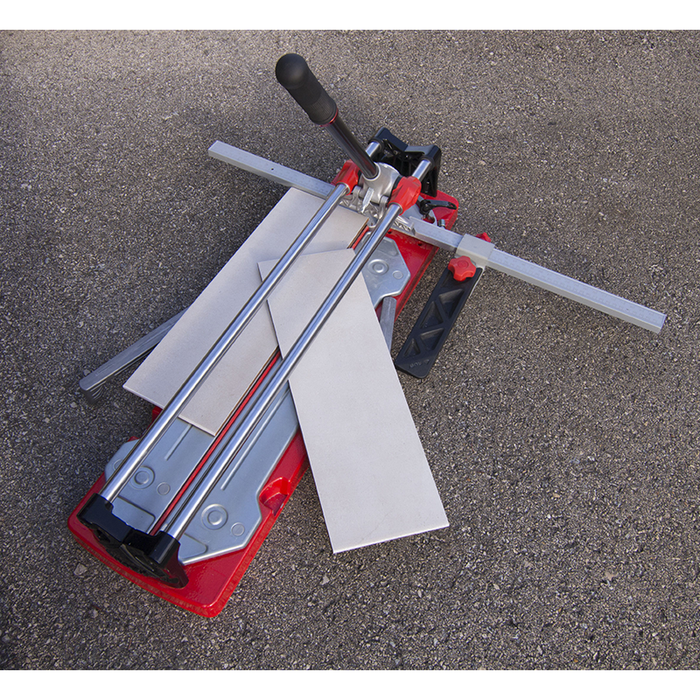 RUBI TR-MAGNET manual cutters have a high-strength two-layer aluminium base with a shock absorption effect and lateral supports for large tiles.